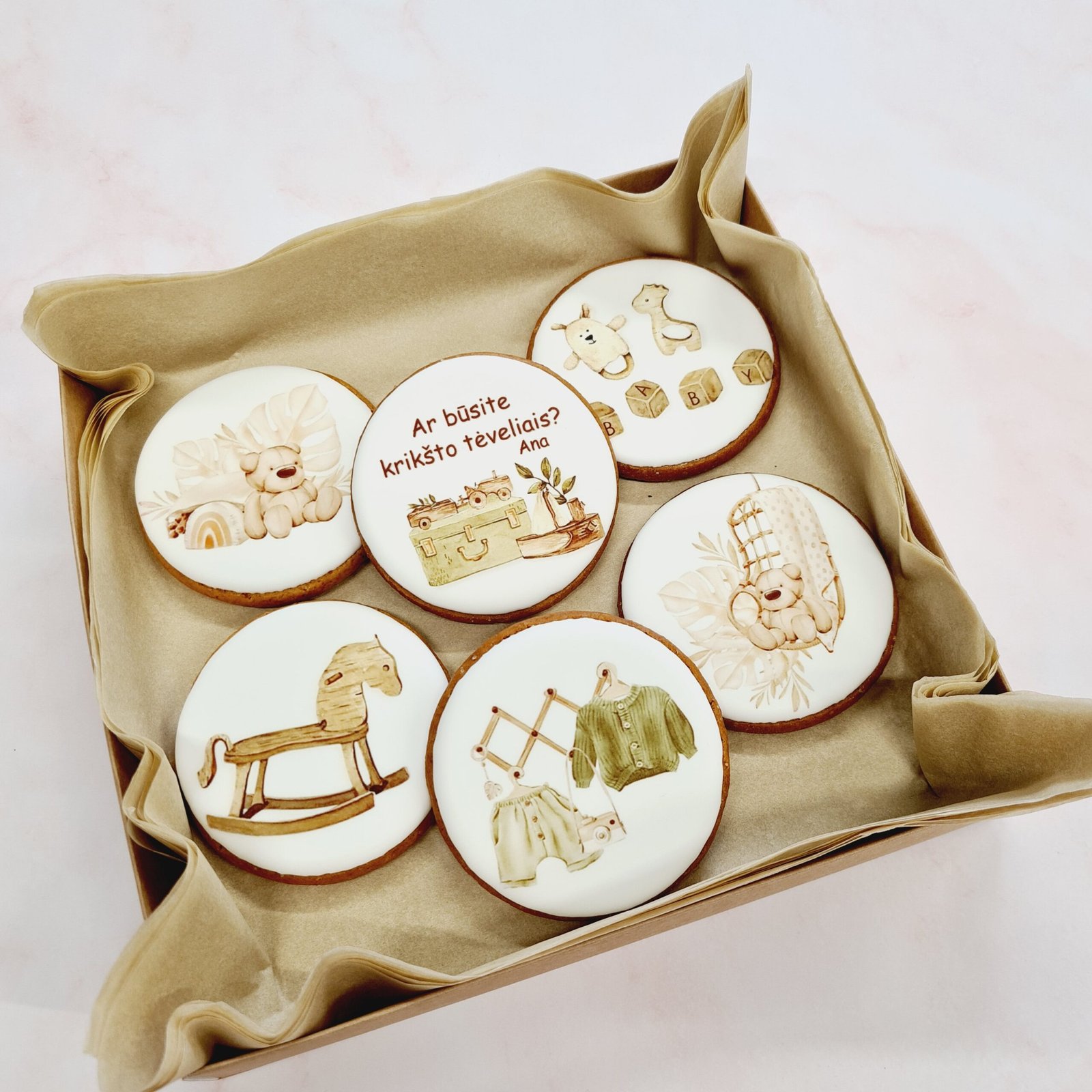 Sausainių rinkinį sudaro 6 imbieriniai sausainiai su krikštynų tematikos dekoracijomis. Rinkinys parduodamas supakuotas dėžutėje. Sausainio diametras apie 8 cm. Kartoninės dėžutės dydis: 20×20 cm.