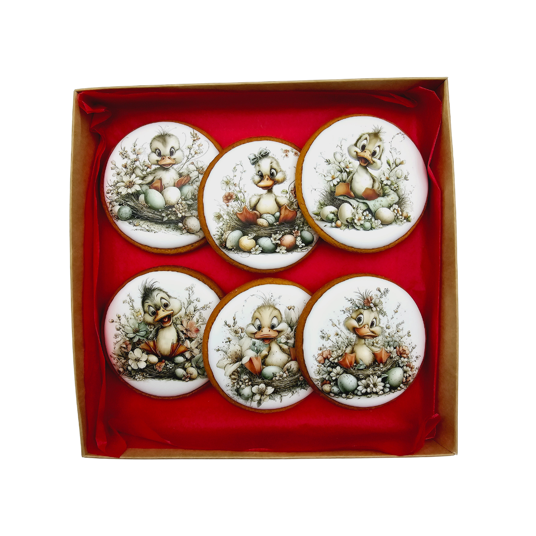 Šeši mieli ančiukai, apsupti margučių ir švelnių gėlių motyvų – mažos Velykų istorijos ant rankų darbo meduolių.