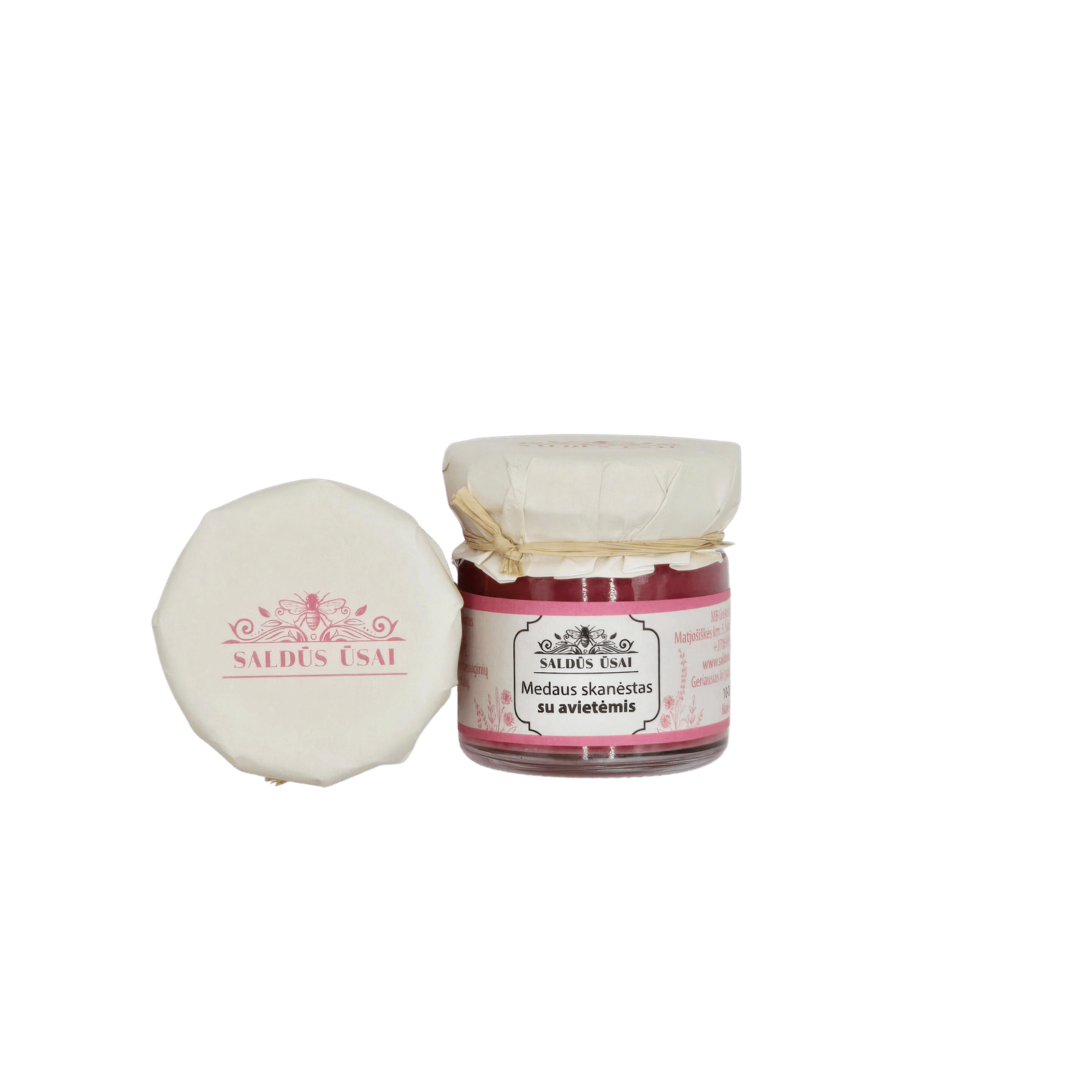 Sudedamosios dalys: medus 95%, šalčiu džiovintos avietės 5%.